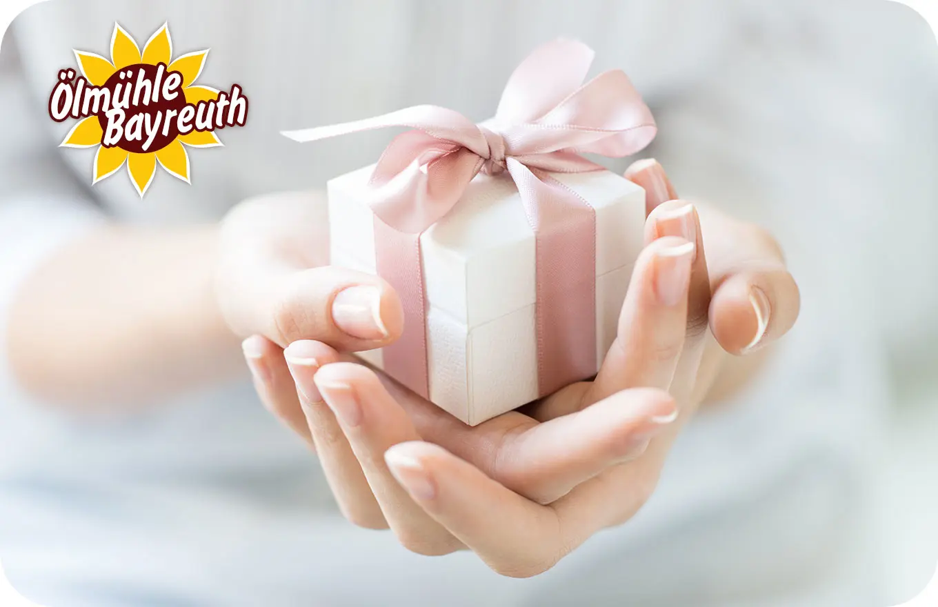 Sende eine personalisierte Geschenkkarte der Ölmühle Bayreuth per E-Mail oder als PDF an die Adresse deiner Wahl.